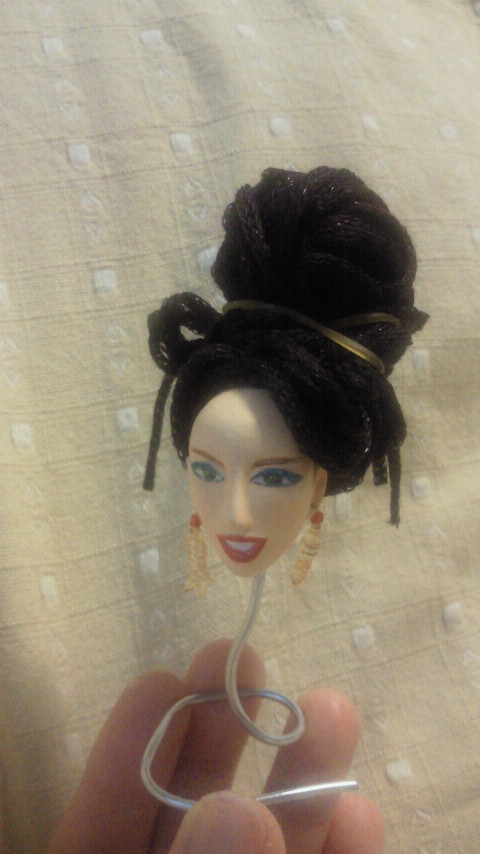 髪の毛を縫いつけて、邪魔にならないようゴムでアップ。