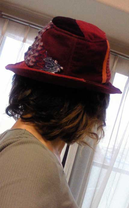 さまざまな布をはいだ、個性的な帽子。お洒落のポイントにします♪