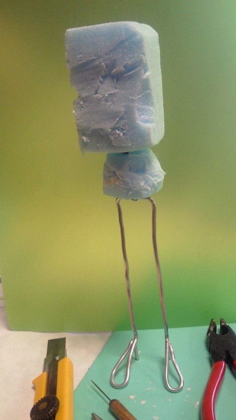 針金の足に、スタイロフォームの胴体をのっける。