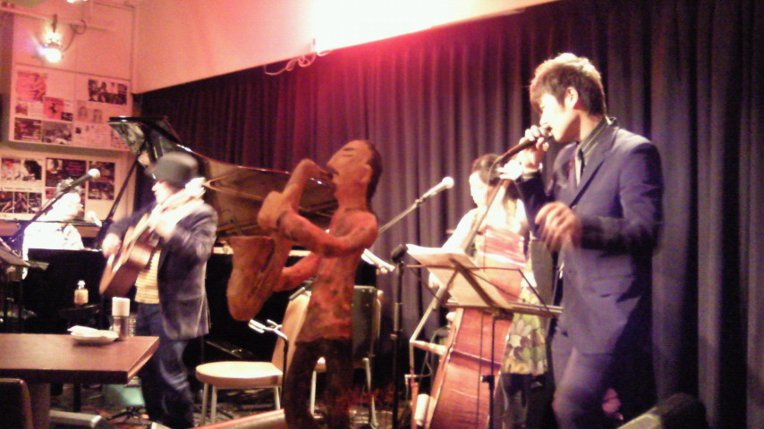 カオリーニョ藤原さん、中島徹さん、東ともみさんのおなじみの面々に、ボイスパーカッションの北村嘉一郎さんという、異色の組み合わせのライブを見に。